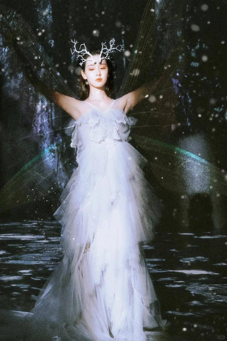在这组写真中,陈都灵身着一袭白色轻纱长裙,裙摆随风微微飘动,仿佛随时会化作一阵雾气消散在森林之中。她长发散落肩头,眼神清澈又带着几分灵动,仿佛林间的小鹿第一次凝望世界,纯真又带有一丝警惕。光影的巧妙运用让整个画面更显梦幻,她仿佛从童话故事中走出来,带着神秘气息,让人一眼心动。